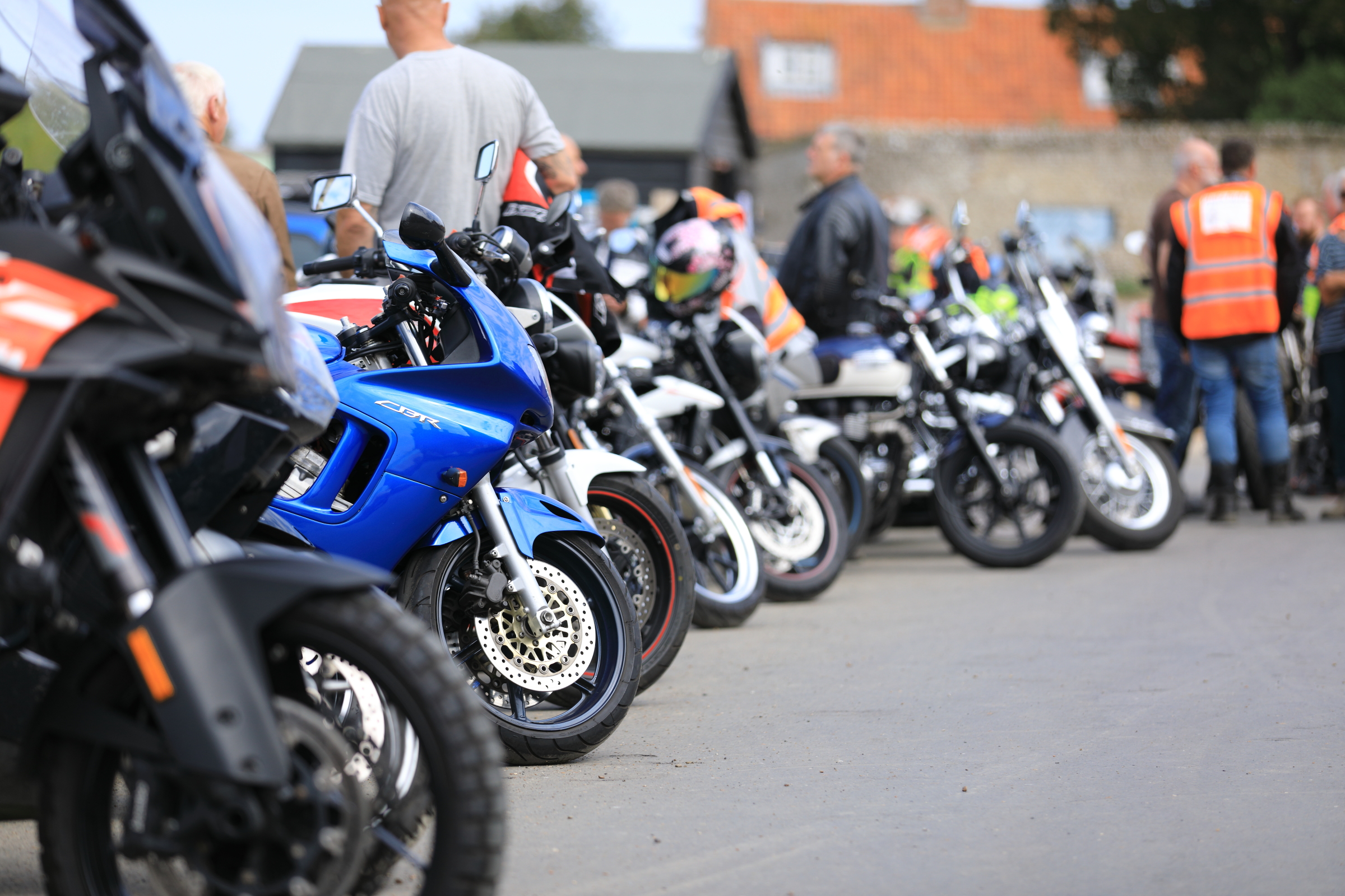 | 2022 Back to full strength from Covid blighted events for the previous 2 years, we were blessed with a lovely sunny day and a strong turnout. The motorcycle cavalcade was this year led for the first time by Phil's brother in-law Graham due to the usual bike being, er, different. Also for the first time people were invited to 'Walk' if they wished, allowing those that didn't have two wheels to take part. A popular local route around the village was used of just over 3 miles in distance. |